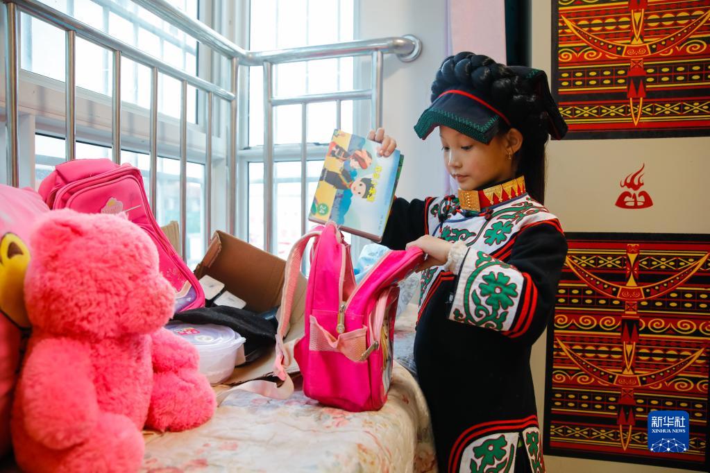 10月28日,在四川省涼山州越西縣越城鎮城北感恩社區,易地扶貧搬遷到此的彝族女孩王小花放學(xué)回家后整理書(shū)包。學(xué)校就在家附近,王小花上學(xué)很方便。