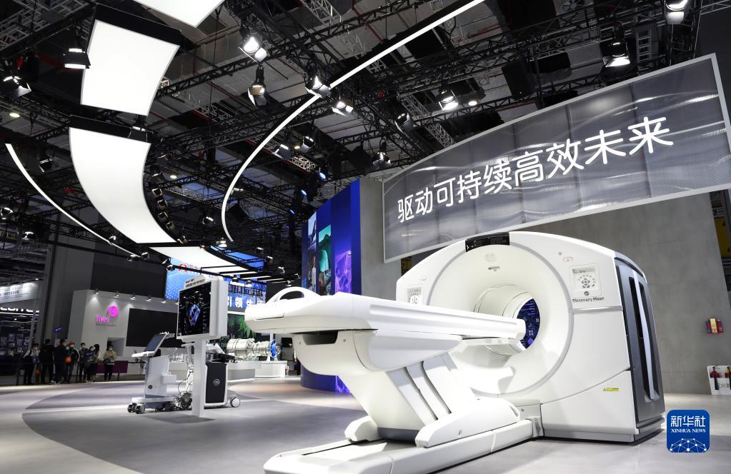 11月2日拍攝的美國GE公司在進(jìn)博會(huì )展臺展出的一臺大型醫療設備。