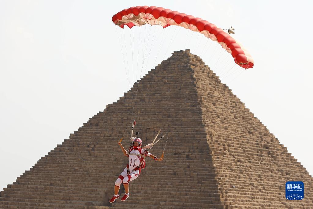11月2日,在埃及吉薩金字塔景區,運動(dòng)員進(jìn)行跳傘表演。