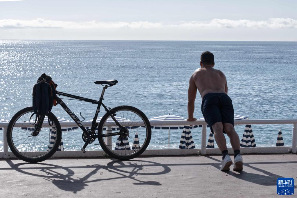 11月2日,一名男子在法國南部海濱城市尼斯的海邊健身。