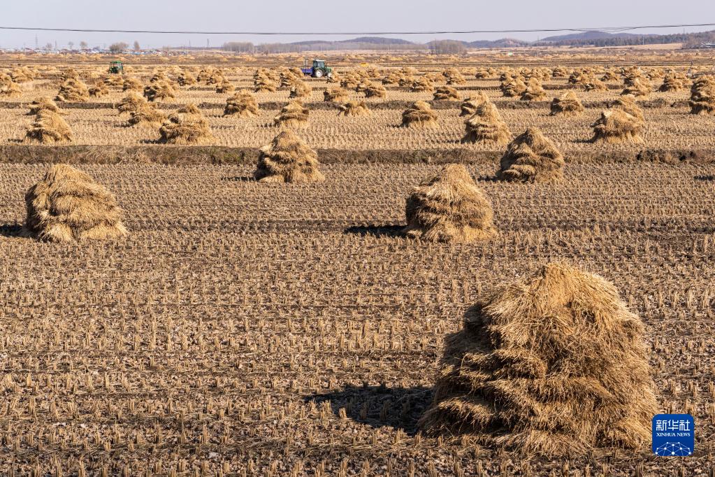 這是黑龍江省五常市稻田中待脫粒的水稻垛(11月2日攝)。
