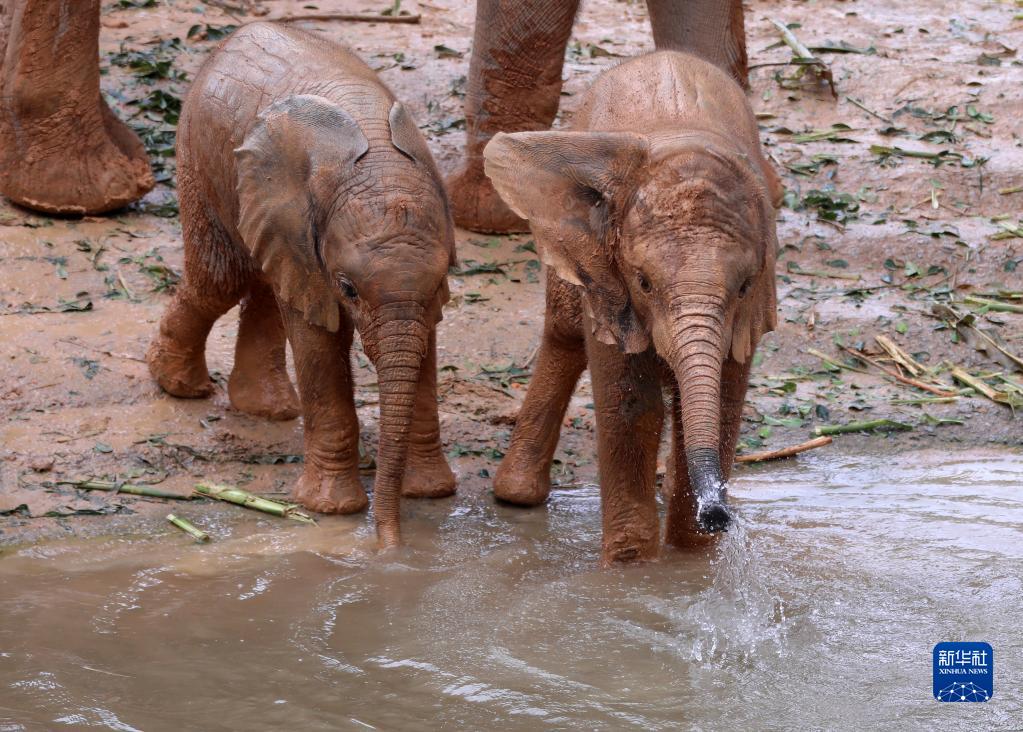 11月3日,兩頭新生非洲象寶寶在玩水。