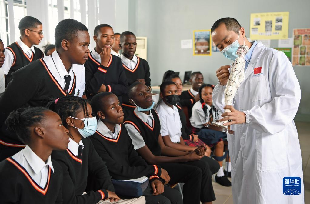 11月3日,在納米比亞首都溫得和克的毛澤東主席中學(xué),中國援納醫療隊醫生為學(xué)生講解人體穴位模型。