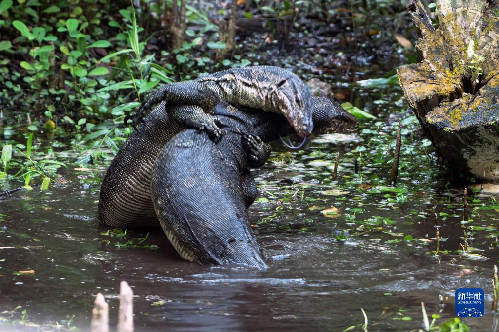 在新加坡雙溪布洛濕地保護區拍攝的兩只馬來(lái)亞水巨蜥(6月27日攝)。