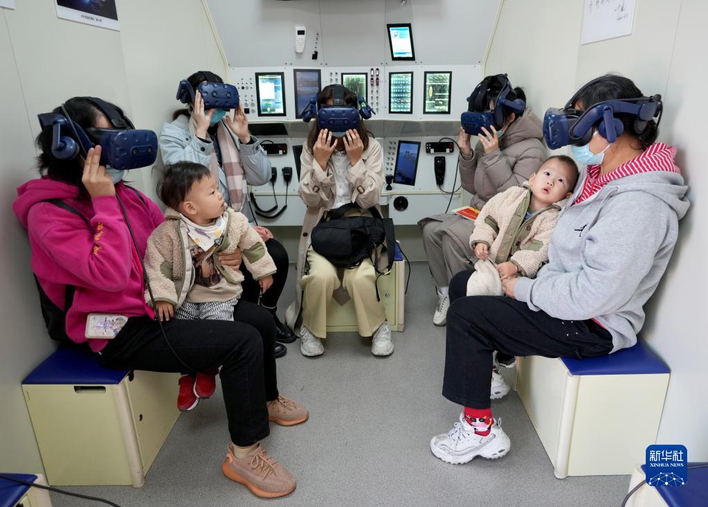 11月4日,王麗鶴(左一)與姐姐(右一)分別抱著(zhù)王麗鶴雙胞胎兒子在“奮斗者”號深載人潛水器模型內通過(guò)VR觀(guān)看海底世界。
