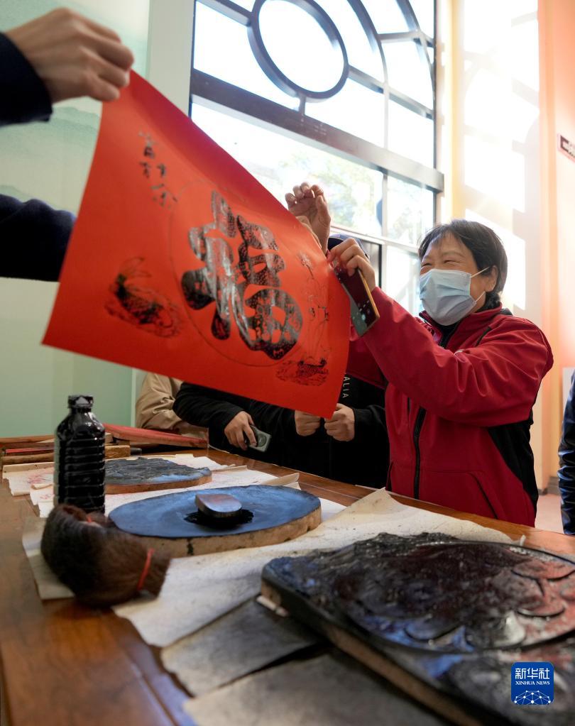 11月4日,來(lái)自北京海淀區的王尚敏(右)在參觀(guān)展覽中的“雕版印刷”演示時(shí),得到工作人員贈送的福字。