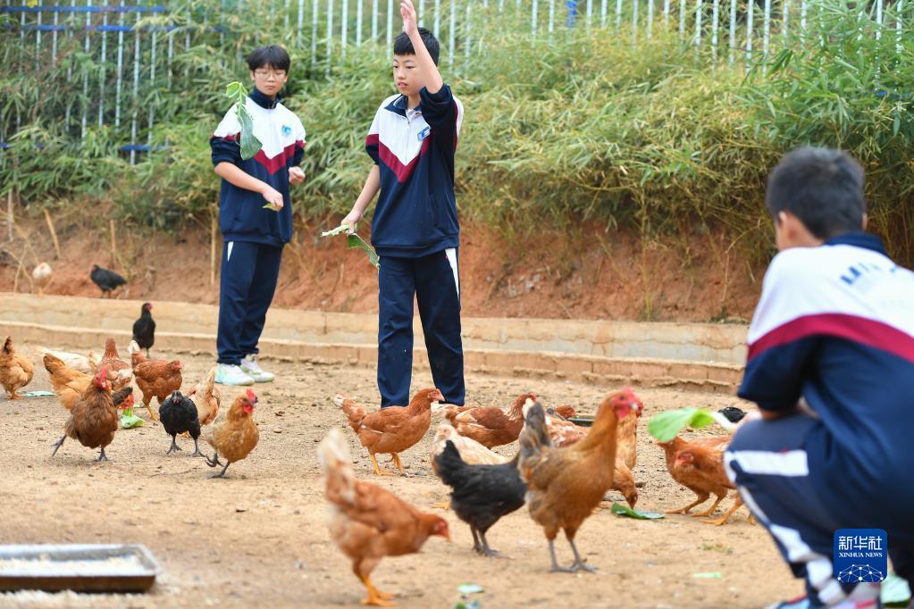 11月4日,在長(cháng)沙市天心區明德啟南中學(xué),學(xué)生們在農場(chǎng)喂養家禽。
