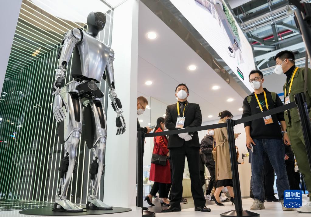11月5日在第五屆進(jìn)博會(huì )汽車(chē)展區拍攝的特斯拉人形機器人。