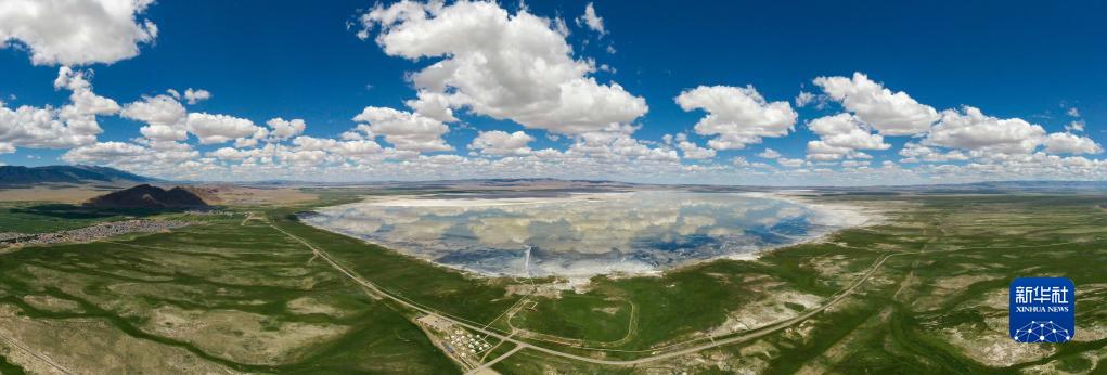 新疆巴里坤湖及湖畔濕地夏季風(fēng)光(2021年7月1日攝,無(wú)人機全景照片)。