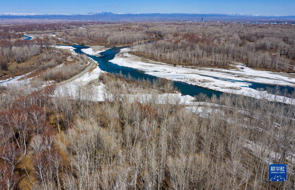 新疆哈巴河及其支流交匯而成的寬淺河灘濕地上遍布白樺林(2021年4月8日攝,無(wú)人機照片)。