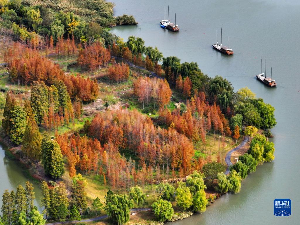 這是11月4日在江蘇省揚州市運河三灣景區拍攝的秋景(無(wú)人機照片)。 新華社發(fā)(孟德龍 攝)