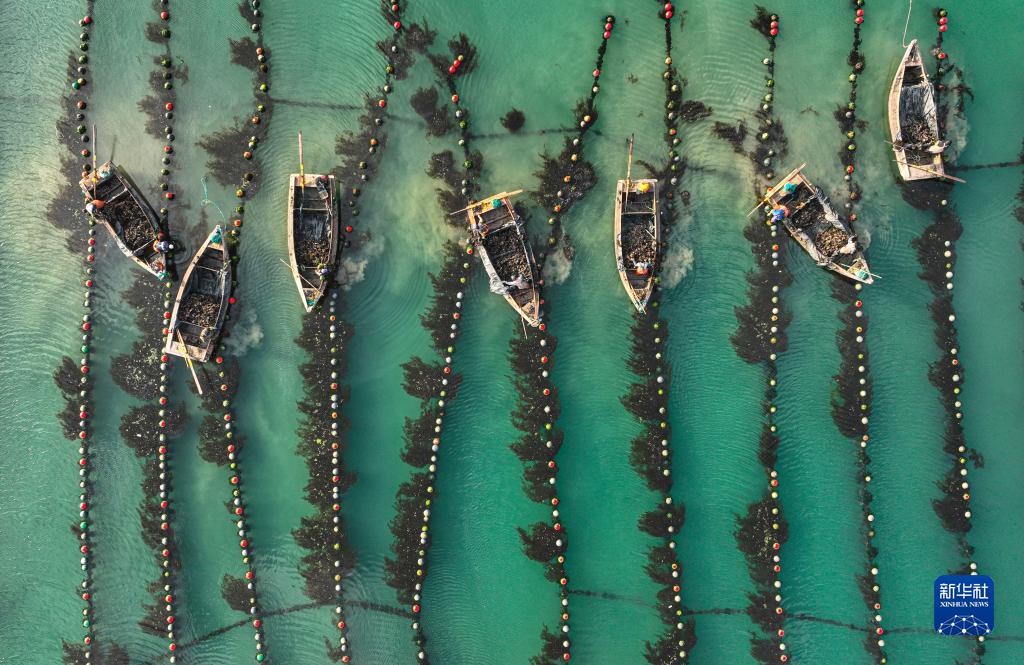 11月1日,在山東榮成愛(ài)倫灣海洋牧場(chǎng),漁民駕駛漁船收獲牡蠣(無(wú)人機照片)。