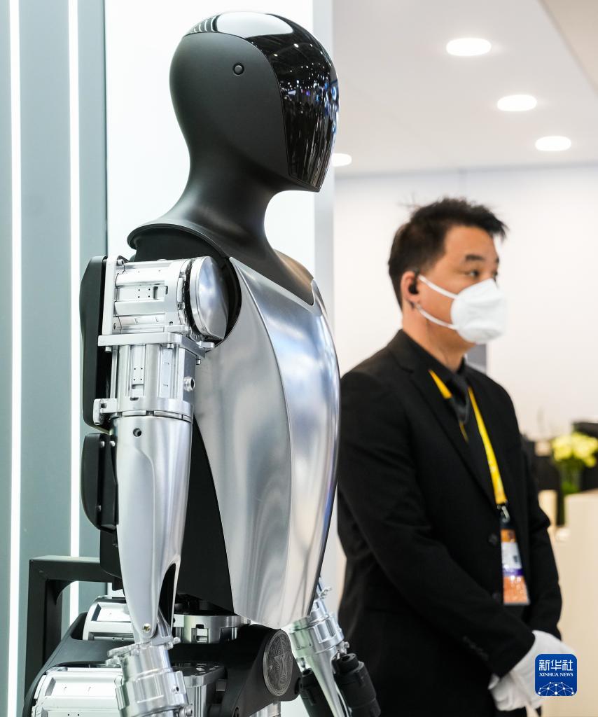 11月5日在第五屆進(jìn)博會(huì )汽車(chē)展區拍攝的特斯拉人形機器人。