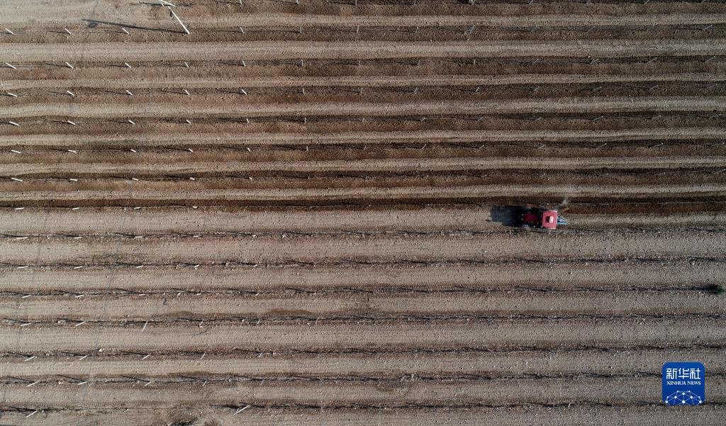 在位于寧夏銀川市賀蘭山東麓的藍賽酒莊,農民進(jìn)行埋藤作業(yè)(11月5日攝,無(wú)人機照片)。