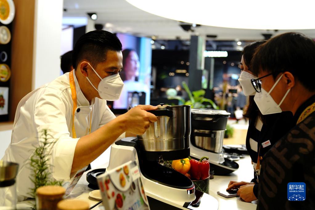 11月6日,參觀(guān)者在第五屆進(jìn)博會(huì )消費品展區參觀(guān)智能烹飪機。