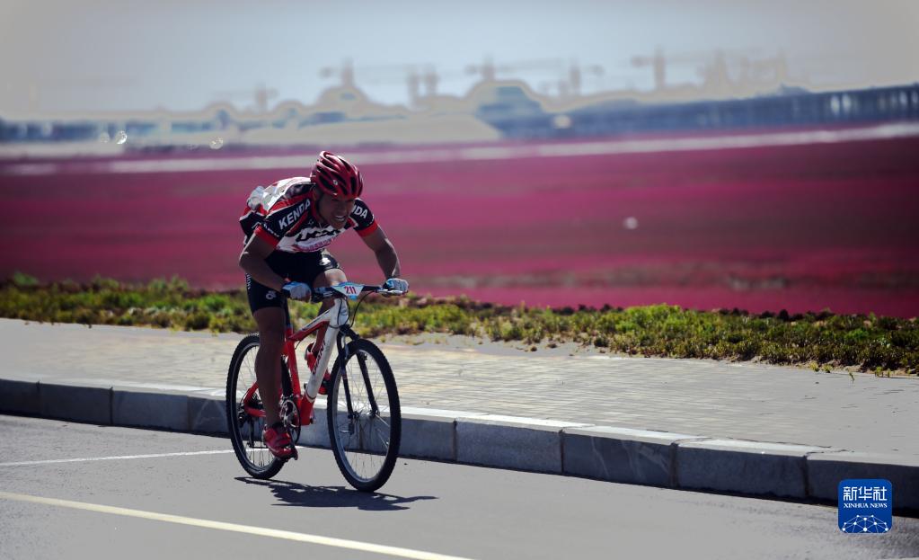 一名自行車(chē)選手在盤(pán)錦紅海灘自行車(chē)邀請賽中騎行(2015年5月30日攝)。
