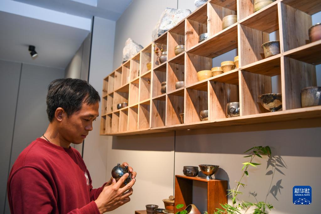 10月25日,在重慶市榮昌區通安村,“90后”手藝人管永雙在陶藝作坊查看作品。