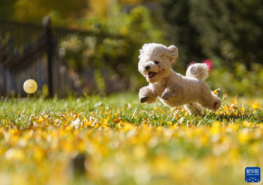 11月7日,一只小狗在北京阜成路路邊綠化帶落滿(mǎn)銀杏葉的草地上玩耍。