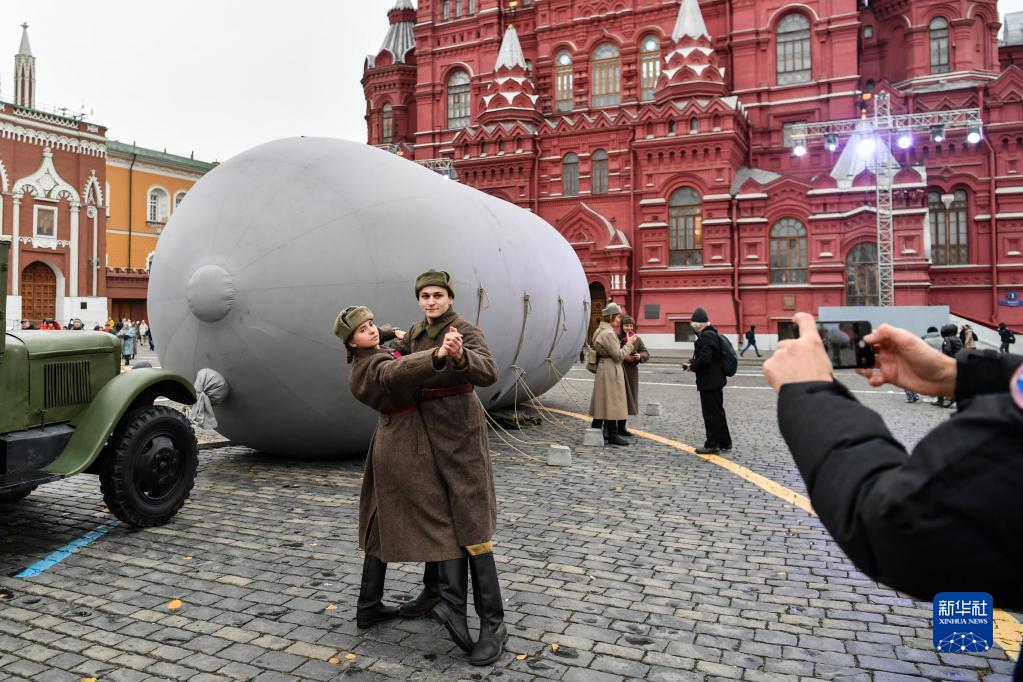 11月7日,在俄羅斯首都莫斯科,人們在以紀念1941年蘇聯(lián)紅場(chǎng)閱兵式為主題的露天展覽上拍照。