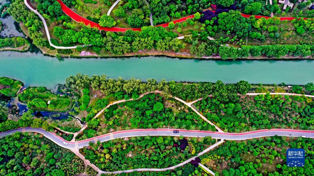 這是山東省濟寧市蓼溝河濕地景色(無(wú)人機照片,2021年5月15日攝)。