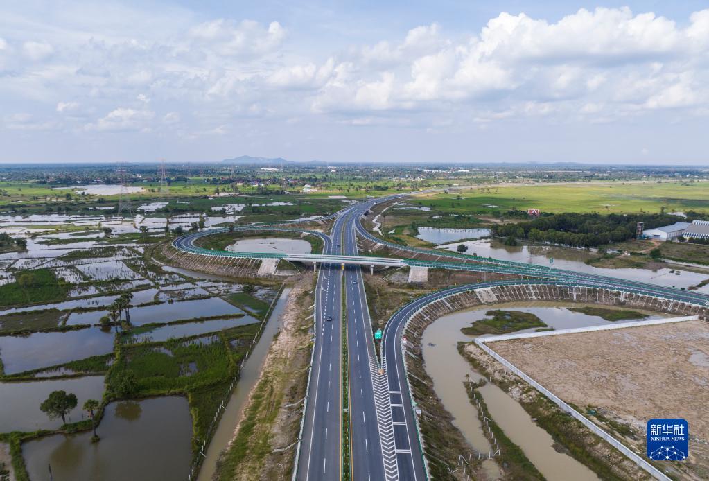 這是10月28日在柬埔寨磅士卑省拍攝的金港高速公路(無(wú)人機照片)。