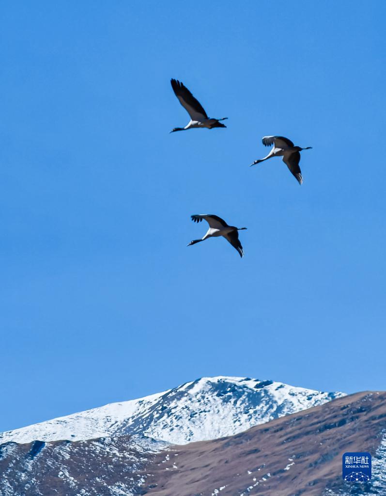 黑頸鶴在林周縣強嘎鄉上空飛翔(11月6日攝)。
