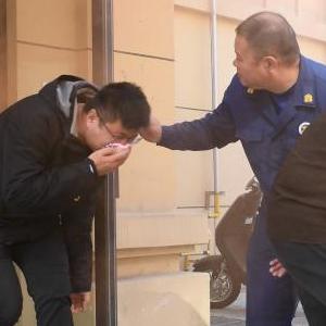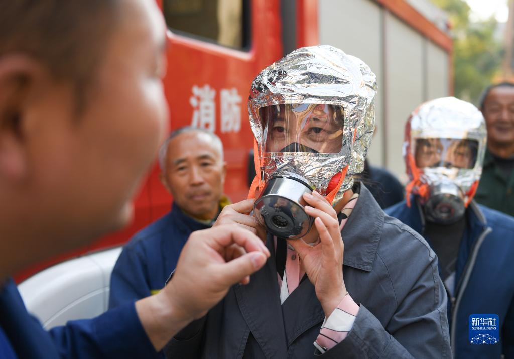 11月8日,在湖州市吳興區環(huán)渚街道一居民區,消防員指導居民佩戴防毒面罩。