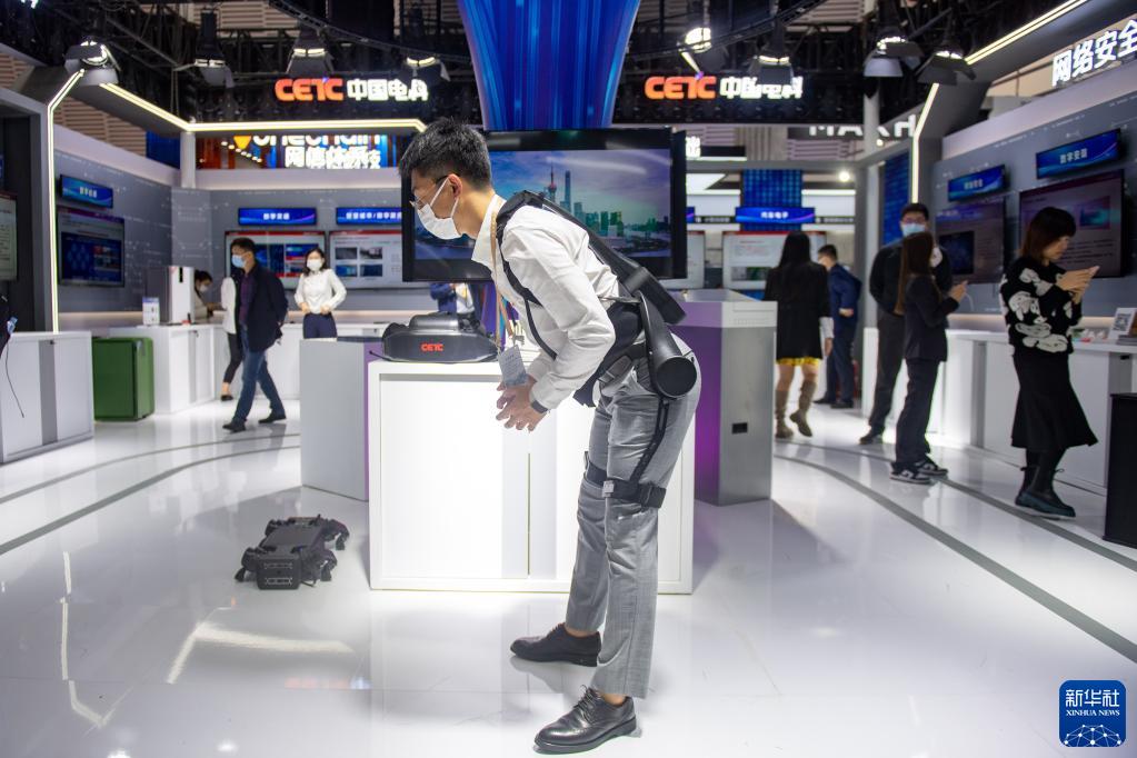 11月8日,中國電科工作人員為觀(guān)眾演示外骨骼機器人的使用。