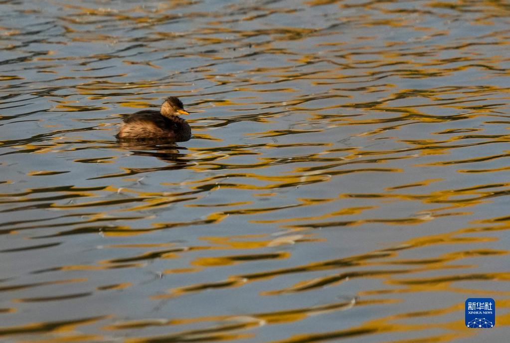 11月7日,在重慶市梁平區雙桂湖國家濕地公園,一只小鸊鷉在湖面游蕩。
