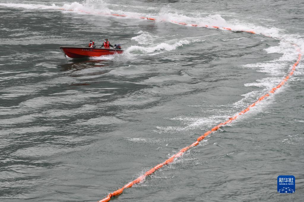 11月9日,在四川省宜賓市敘州區,演練人員駕駛快艇查看圍油欄布設情況。