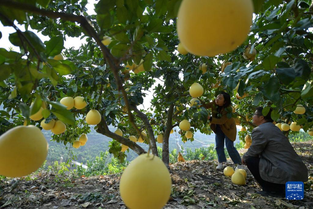 11月9日,在宣恩縣李家河鎮的柚園里,游客在采摘貢水白柚。
