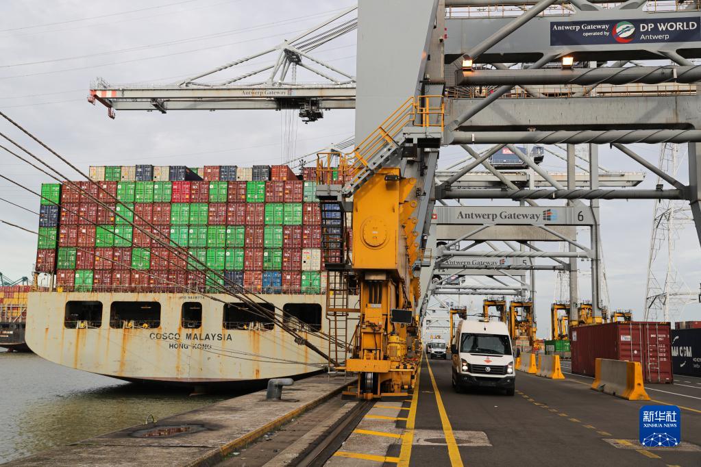 10月27日,在比利時(shí)安特衛普,船舶??吭诒壤麜r(shí)安特衛普-布魯日港的集裝箱碼頭。新華社記者 鄭煥松 攝
