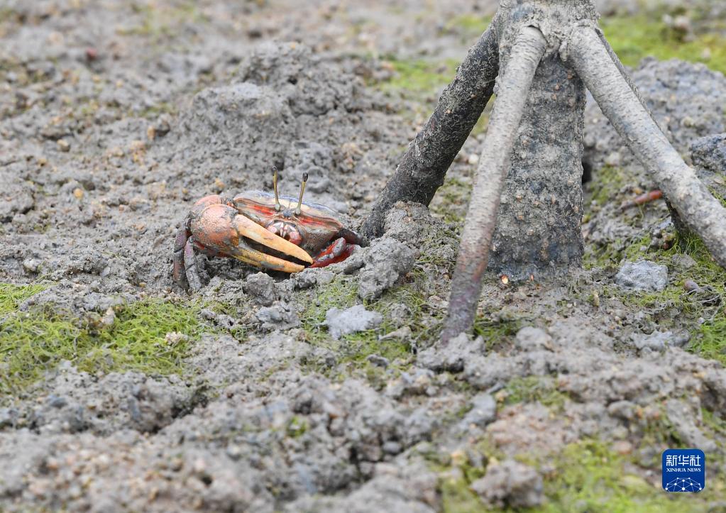 11月8日在海南省儋州市新英鹽場(chǎng)濕地拍攝的蟹類(lèi)生物。新華社記者 蒲曉旭 攝