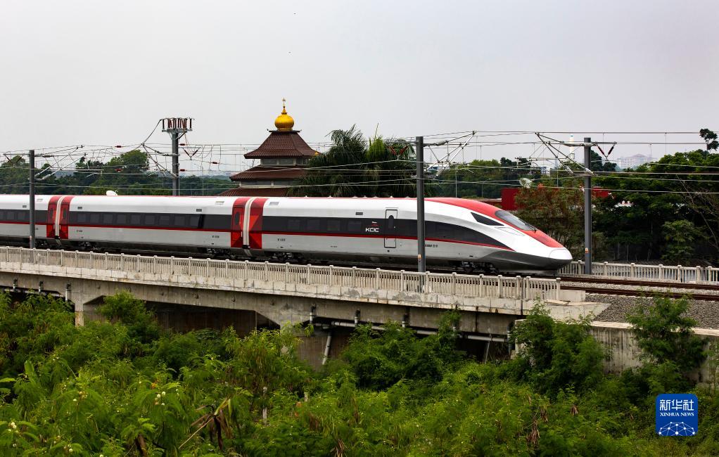 11月9日,在印度尼西亞西爪哇省萬(wàn)隆市,一列高鐵動(dòng)車(chē)組正在雅萬(wàn)高鐵試驗段進(jìn)行熱滑試驗。