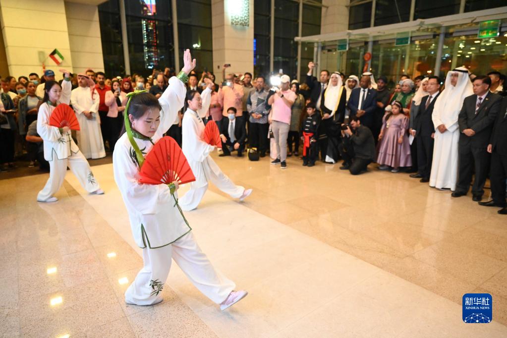 11月8日,人們在科威特首都科威特城國家圖書(shū)館參加“新時(shí)代中國的非凡十年”圖片展暨中國電影美食文化節時(shí)觀(guān)賞太極表演。