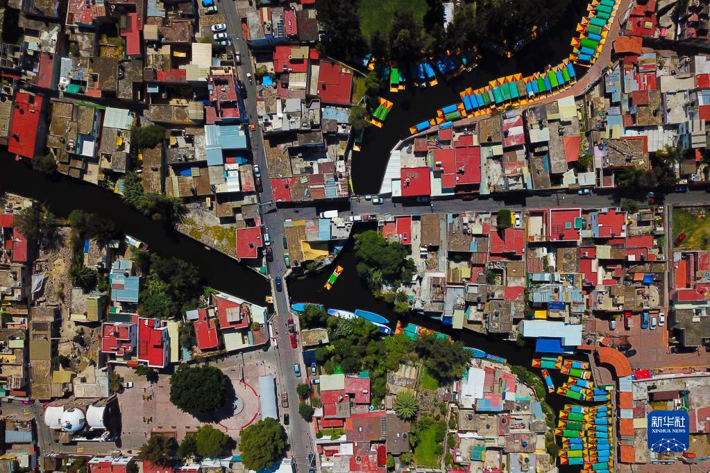 在墨西哥首都墨西哥城霍奇米爾科,游船停泊在運河內(航拍照片,2020年10月23日攝)。
