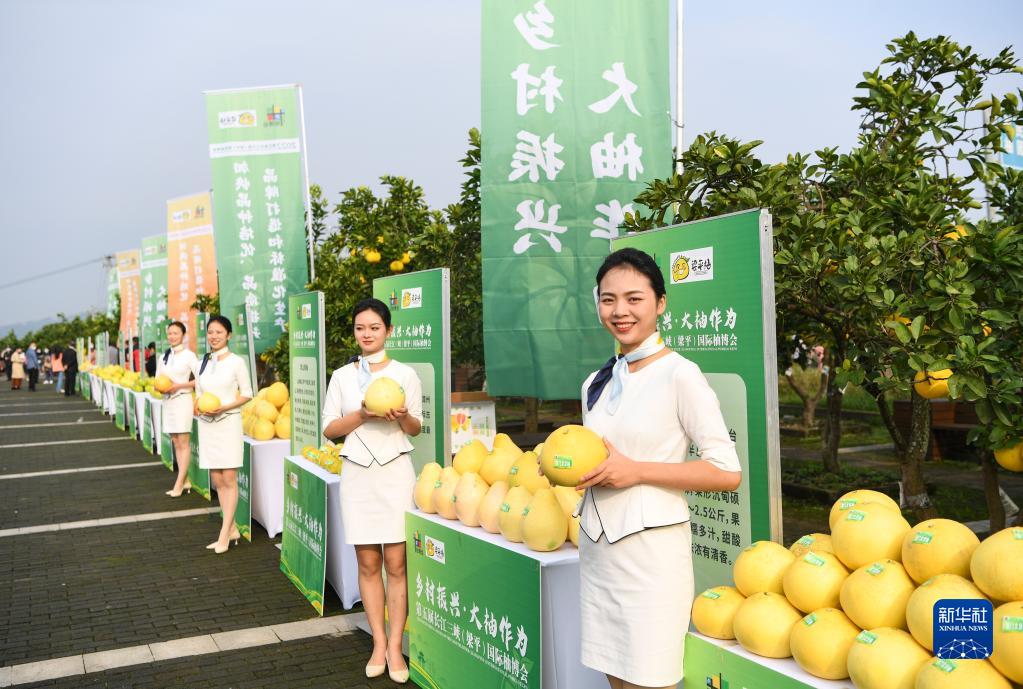 11月9日,在重慶市梁平區合興鎮龍灘村,工作人員在柚博會(huì )上展示柚子。