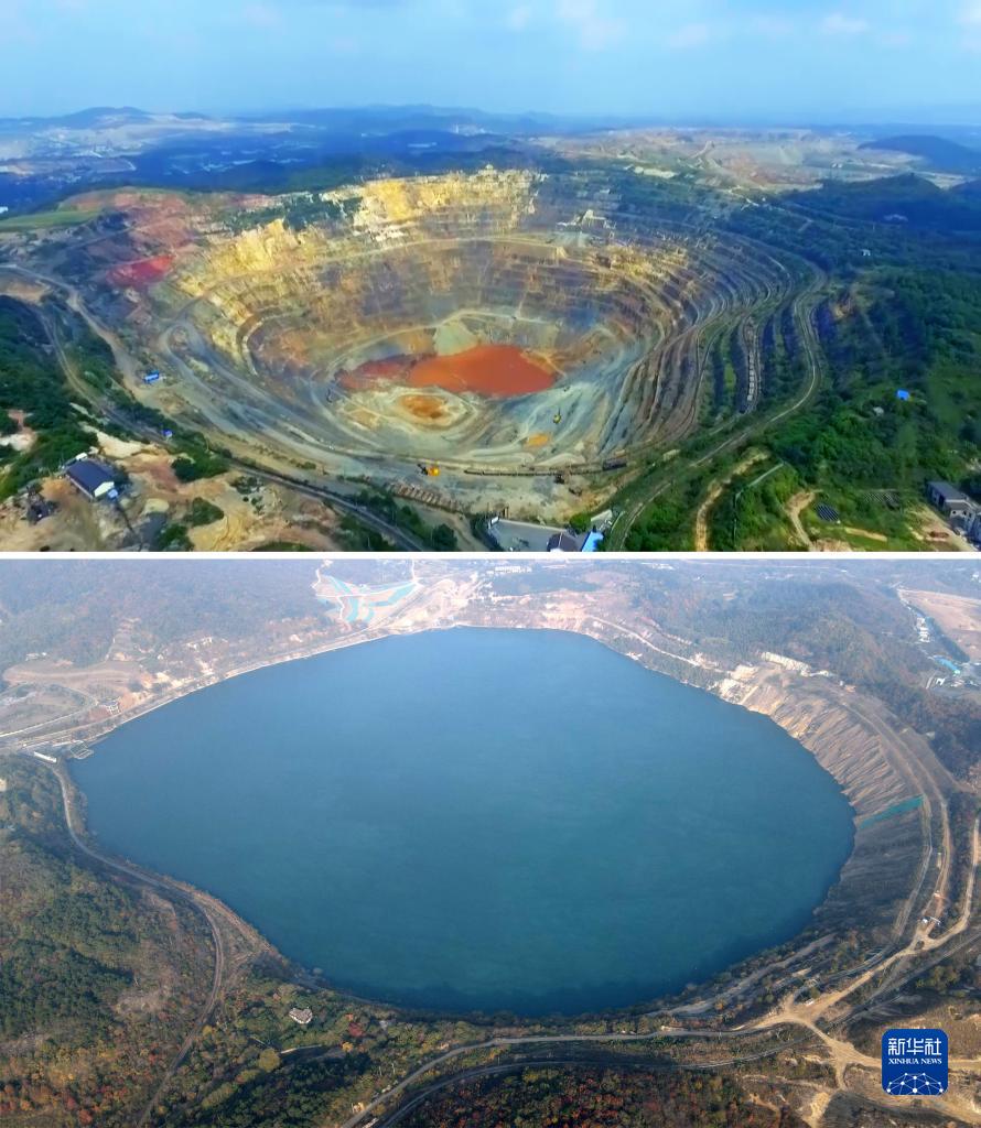 拼版照片:上圖為開(kāi)采中的向山鎮凹山采場(chǎng)(資料照片),下圖為生態(tài)修復后的凹山采場(chǎng)(新華社記者劉軍喜11月8日攝,無(wú)人機照片)。