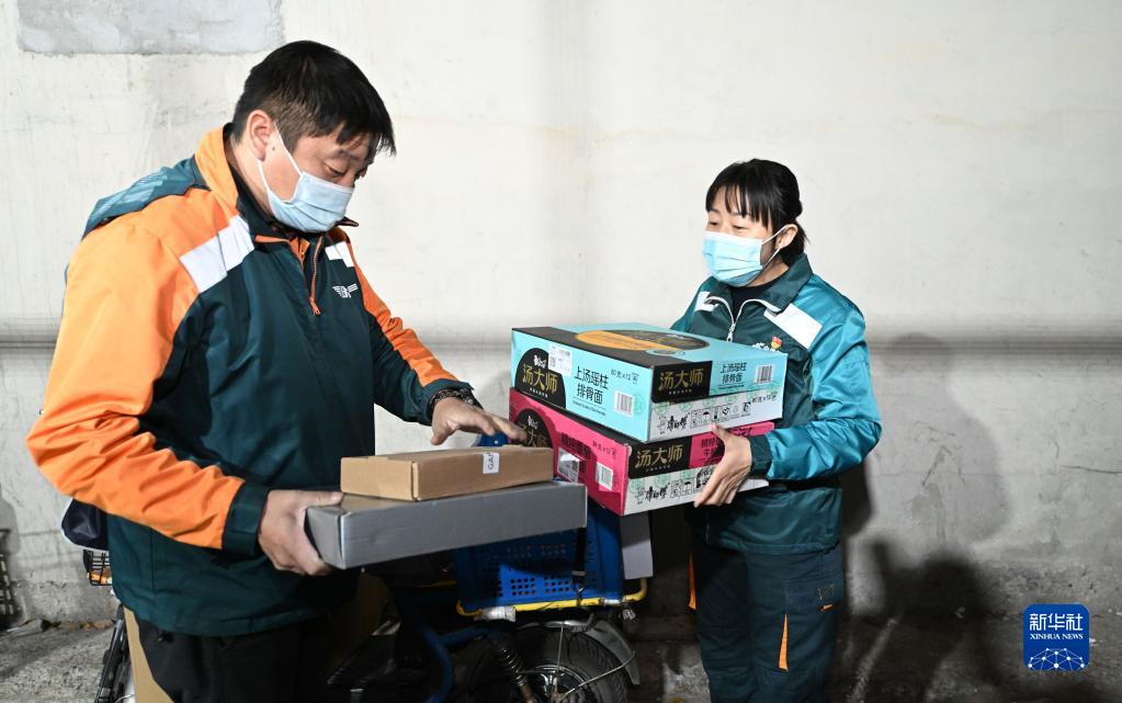 11月7日,在中國郵政集團有限公司天津市和平區分公司貴州路速遞營(yíng)業(yè)部,劉婷(右)與同事接收新攬收快件。