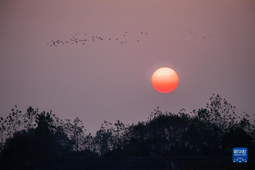 這是11月10日在湖南西洞庭湖濕地拍攝的夕陽(yáng)和候鳥(niǎo)。