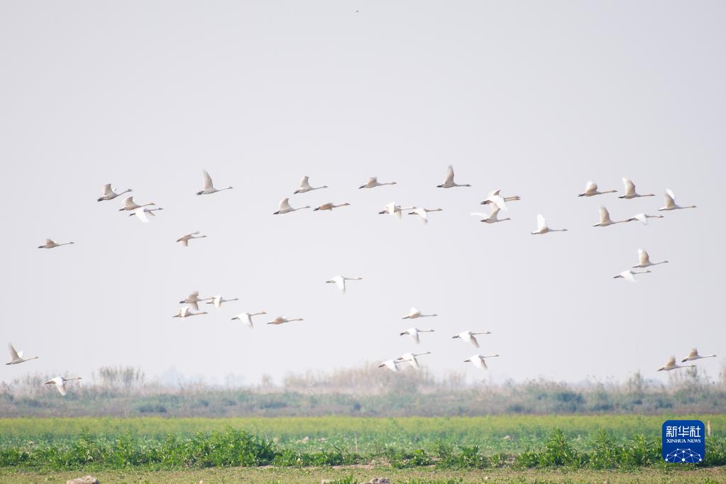 11月10日,小天鵝在湖南西洞庭湖濕地上空飛翔。
