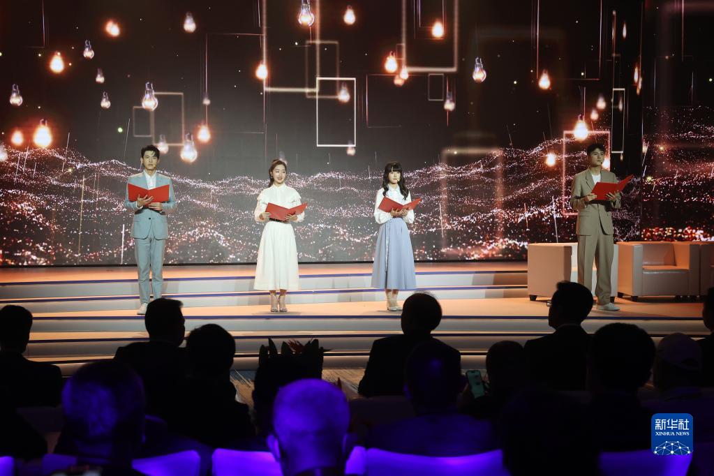 11月10日,演員辛云來(lái)、鄧恩熙、徐嬌、王廣源(從左至右)在2022年中國金雞百花電影節開(kāi)幕式上表演詩(shī)朗誦《時(shí)代之聲》。