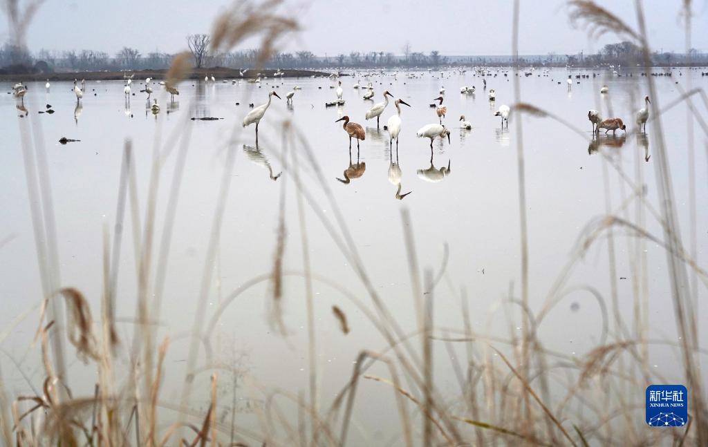 在南昌市高新區五星白鶴保護小區,白鶴、天鵝等候鳥(niǎo)在濕地中棲息覓食(1月12日攝)。