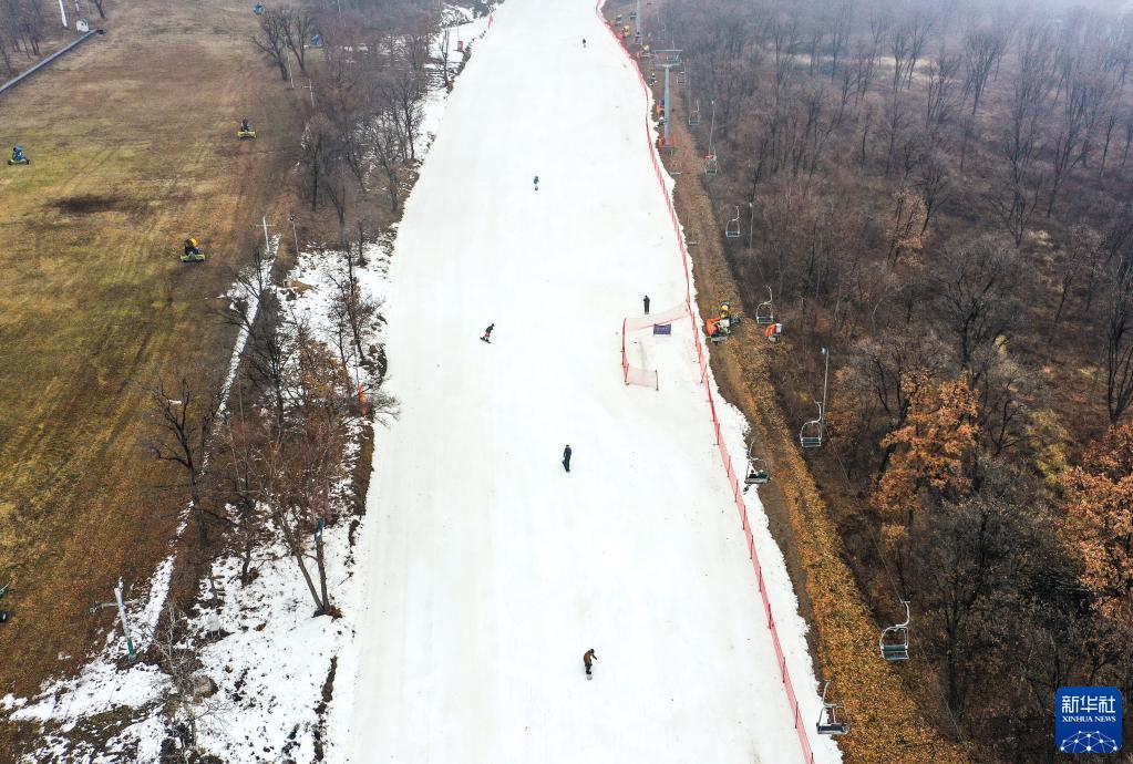 11月11日,滑雪愛(ài)好者在長(cháng)春市廟香山滑雪場(chǎng)滑雪(無(wú)人機照片)。