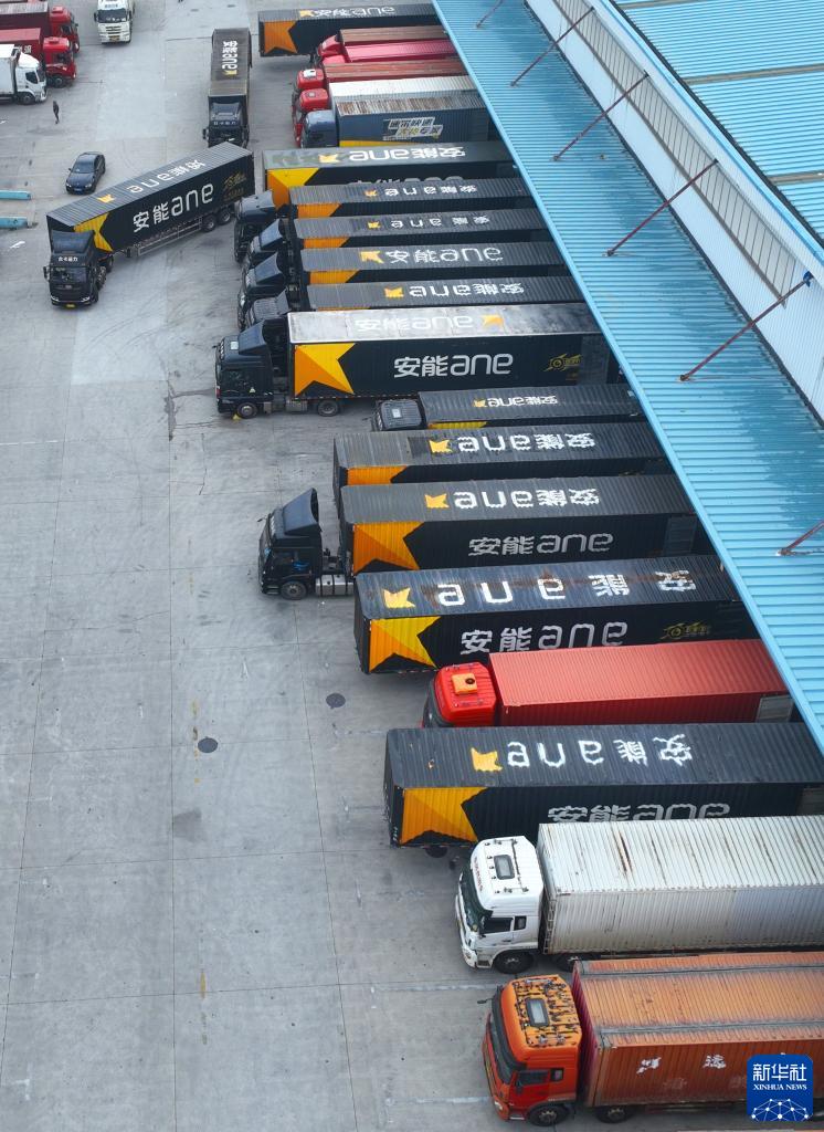 11月11日在江蘇省南通市崇川區幸福街道寶灣物流園拍攝的快遞運輸車(chē)輛(無(wú)人機照片)。