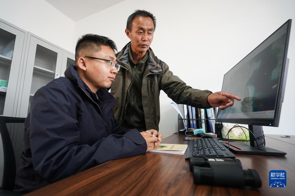 保護區科研人員陳衛華(右)和李洪磊通過(guò)衛星追蹤器監測救護后放飛自然的東方白鸛活動(dòng)以及遷移路線(xiàn)(11月7日攝)。