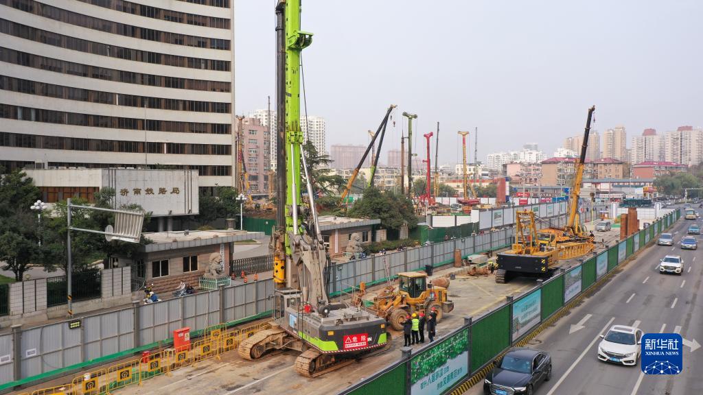 11月11日,在濟南地鐵6號線(xiàn)濟南站,中鐵十局工作人員在進(jìn)行主體圍護結構首樁開(kāi)鉆作業(yè)(無(wú)人機照片)。