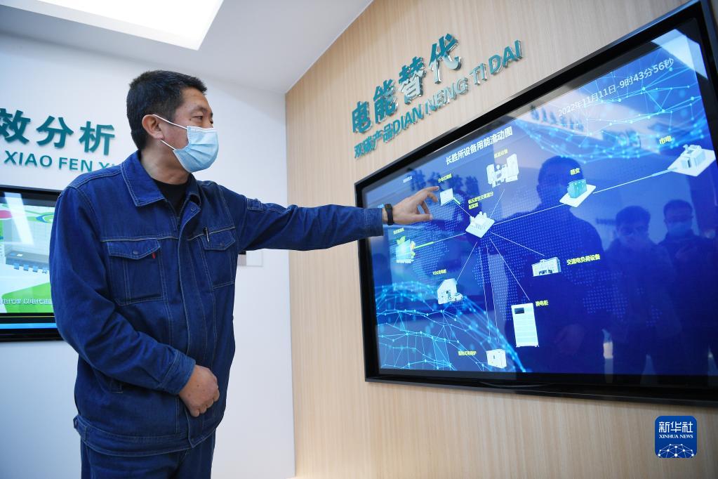 11月11日,國網(wǎng)寧夏電力石嘴山供電公司長(cháng)勝供電所工作人員在介紹智慧用能管理系統實(shí)時(shí)監測光伏發(fā)電、用電情況。