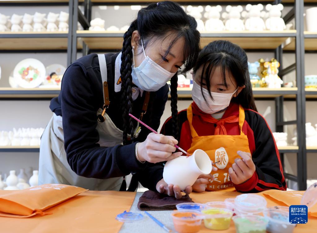 11月11日,江蘇省徐州市漢王鎮紫山村春泥陶藝的老師(左)在陶藝教室向學(xué)生講解彩陶繪陶的有關(guān)知識。