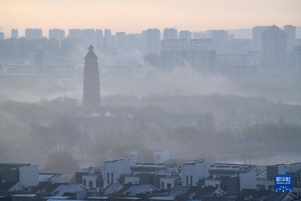 這是銀川上空的平流霧景觀(guān)(11月12日攝,無(wú)人機照片)。